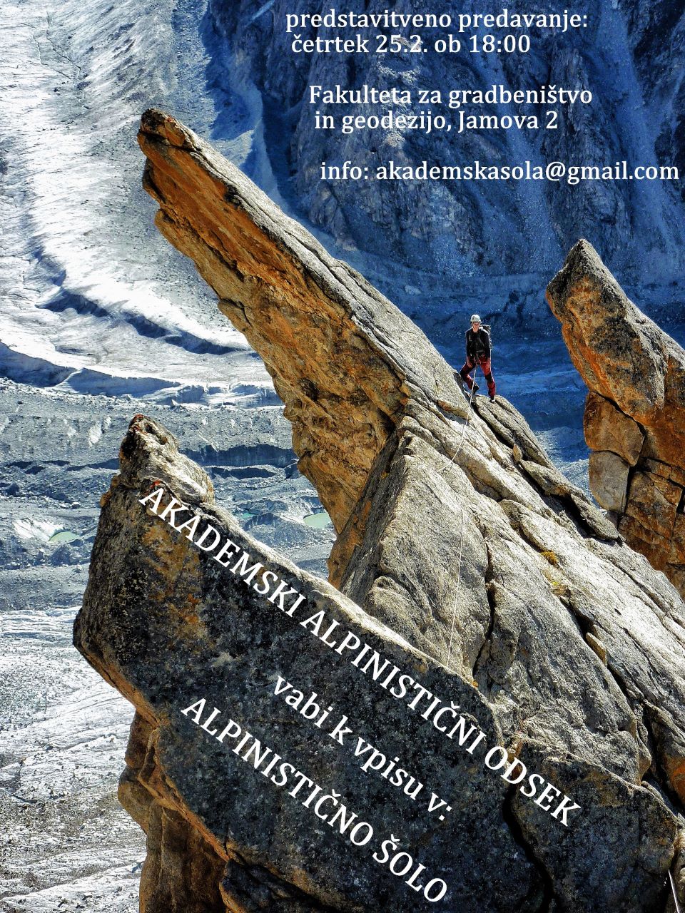 Vabljeni na predstavitveno predavanje AAO alpinistične šole za leto 2016/17 v četrtek 25.2. ob 18:00 na Fakulteti za gradbeništvo in geodezijo, na Jamovi 2 v Ljubljani.