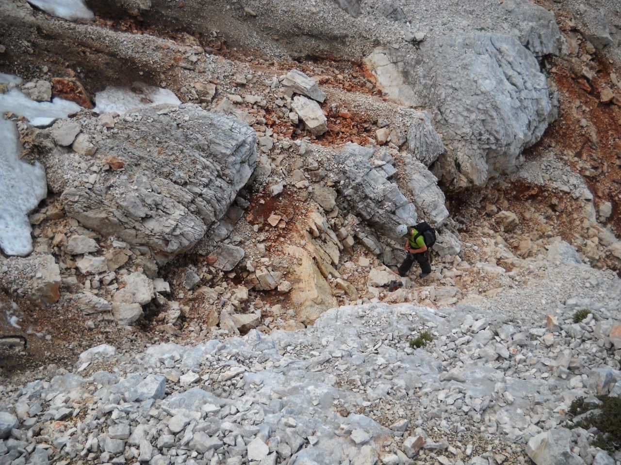 Na pot sva krenila zgodaj, zato je na dostopu še svetila luna (glej fotografije). Ker je Matic turi želel dodati še ščepec avanturizma, me ni vodil po poti, temveč sva jo ubrala skozi bolj zanimivo ruševje. Prva dva raztežaja šodrastega začetka smeri sva splezala nenavezana, pred prvo (še vedno krušljivo) trojko sva se navezala. Po tem raztežaju je sledilo šest raztežajev zelo lepega plezanja po kompaktni skali. Zadnji del smeri se je končal kot se je prvi začel: s kršem, šodrom, vmes skoki. Razlika je bila ta, da je bil zgornji del bolj odprt kot spodnji, bilo ga je za 200 višinskih metrov, najlažji možni prehod (baje) ni bil prehoden in ni mu bilo videti konca. Na začetku zadnjega dela mi je šlo še kar dobro (zvezdica od Matica), bolj ko sva se bližala vrhu, bolj negotova sem postajala, prehodi so se mi zdeli vedno težji in bolj pokonci, zato sem za zadnjih 20 metrov zaprosila za štrik. Meni, ki v šodru nisem suverena, je ta del predstavljal takšen podvig, da sem do vrha smeri pozabila, da sva sploh plezala.