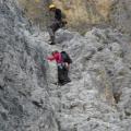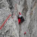 Minuli vikend sem se s tremi člani jeseniškega AO-ja (Matic Košir, Lea Dežman, gospod Roman (Udir)) mudila v Dolomitih. Na pot smo krenili v petek popoldne, v Canazei prispeli pozno zvečer, zmatrani iskali ljudi (ki naj bi tam bili), kasneje iskali kamp, ki smo ga zaradi pregrešno dragih cen bojkotirali in prespali na parkirišču pred hotelom. Naslednje jutro smo se po zajtrku (brez kave, ker se je Maticu mudilo) odpeljali proti prelazu Sella in z Maticem sva v Piz Ciavazes plezala smer Schubert. Na vstopu v smer sem bila Maticu hvaležna, da nam ni dovolil skuhati kave, saj sta bili pred nami že dve navezi (ena trojna) in za nami še dve češki. Po pričakovanjih smo se prve tri raztežaje čakali, na štantih je bila gužva a bolj ko smo se bližali vrhu, manj je bilo čakanja. Smer je zelo lepa s kompaktno skalo; edina slabost je, da se začne z najtežjim raztežajem (VI), ki ga moraš preplezati neogret s premraženimi prsti (ki jih običajno sploh ne čutiš). Poleg tega so se mi zdeli raztežaji, ocenjeni s IV težji kot tisti z oceno V. Razlog za to verjetno tiči v tem, da so v štiricah same šalce, ki pa so precej narazen in jih ne dosežem, v peticah pa je več manjših oprimkov.