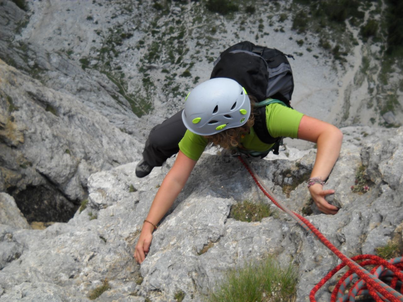 Sestopila sva dovolj zgodaj (tam kjer so drugi abzajlali, sva šla z Maticem peš, da ni bilo treba vrste za abzail čakati-to se vidi na eni zmed fotografij. Ja, špartanska je ta jeseniška šola), da sva imela dovolj časa za še eno krajšo smer (pa še slabo vreme je bilo napovedano za naslednji dan, tako da je bilo treba izkoristiti še zadnje šanse). Plezala sva Trenkerjevo poč, za katero v vodničku piše, da je zelo plezana in temu primerno zlizana. To sem najbolj opazila v rahlo previsni poči z oceno V, kjer se na ključnem mestu klin kar ponuja, da stopiš nanj (zato ga nisem razočarala). Smer me ni impresionirala.