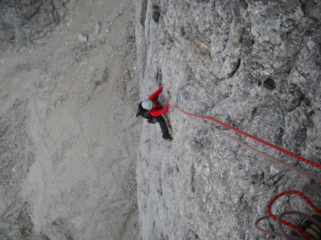 Naslednje jutro sva plezala Messnerja v drugem stolpu Selle. V načrtu sva imela sicer eno drugo smer, ki pa je bila mokra, nato sva se odločila za eno, ki ima vstop v Messnerju in se po prvem raztežaju nadaljuje levo v težko prečko, za katero je Matic sklenil, da je nad njegovim trenutnim stanjem vplezanosti (z naslednjim varovanjem 15 metrov nad detajlom) in še više nad mojim, zato je obrnil in smer sva nadaljevala po Messnerju. To smer sem lani sicer že plezala z Blažem, zato bom to priložnost izkoristila za kratko samoevalvacijo. Smer se mi je zdela lepša kot lani, verjetno zaradi izkušenj v hribih, ki sem jih pridobila od lani. Najtežje dele, v katerih sem lani preklinjala in se spraševala, "kaj mi je treba tega", sem tokrat preplezala brez jamranja. Tudi v prečkah, v katerih pri meni navadno potekajo težki porodi, sem zlezla dokaj suvereno in brez paničarjenja. Veseli me napredek, ki sem ga opazila pri sebi od lanskega leta. Ta se navezuje predvsem na odnos do hribov in ne toliko na vplezanost ali sposobnost izvedbe težjih gibov. Kar se tiče tega, sem bila lani v boljši formi (vsaj mislim da), se pa pozna vsaka preplezana smer v hribih. Smer je zelo lepa, saj je pokonci, z dobro skalo in ravno dovolj oprimki in stopi, da jih ni niti preveč, niti premalo. Tudi težavnost si sledi dokaj konstantno do zadnjih parih raztežajev, ki so lažji. Kot lansko leto, sem tudi tokrat na drugem štantu (visečem) čakala navezo, ki je prehitevala po bližnjici. Matic je drugaga v navezi približno 20 minut čakal na sredini raztežaja, saj je omenjeni gospod omagal in je prusikaril. Edina prednost od lani je bila ta, da se mi na štantu ni zamotal štrik. Kot dan poprej se je proti vrhu gužva porazgubila in sva lahko plezala v lastnem tempu brez čakanja.