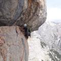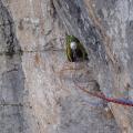 Kakorkoli že, smer je nora, Jan jo je zmogel prosto, jaz pa sem raztežaju pod prečko priznal premoč in si pomagal s klinom. Prehod na polico je zelo hilaričen, v kolikor ti je do smeha seveda