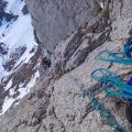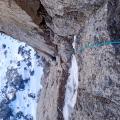Glede na to, da sneg v steni ni bil niti malo predelan, sem pomislil, da bi lahko probal še v kakšni smeri, ki ni dolga in omogoča tudi hiter pobeg v primeru neugodnih razmer. V mislih sem imel Levo smer v Dedcu, ki ponuja zelo lepo plezarijo z dobro opremljenostjo. Tako sva 31.12. z Luko Kramaričem zagazila proti Korošici. Luka se je pred kratkim pridružil našemu odseku(se ve, kdo da za rundo na občnem). Pod steno nisva bila presenečena, bila je povsem kopna, v steni pa sva cepine imela večino časa na pasu, saj je bilo dovolj toplo, da sva plezala brez rokavic. Zanimiva zima, nimaš kej. V primerjavi z dolgim dostopom sva bila čez smer kar hitro in se zato na vrhu še nastavljala toplemu soncu.