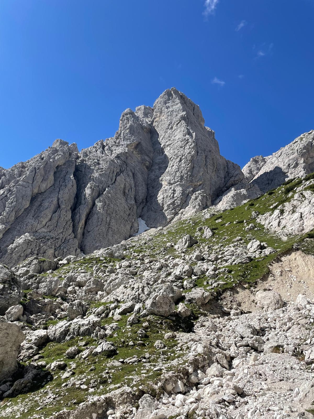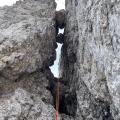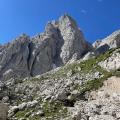 V nadaljevanju sva zavila oziroma bolje rečeno poprečila raztežaj levo, pod začetek značilne rampe. Sledila sva nato pravemu poteku smeri. Naveza pred nama se je odločila izstopiti po desni grapi, ki je zagotovo precej naložena in se jo pogosteje rabi v zimskem času. Naenkrat je začelo iz omenjene grape leteti kamenje in komaj sva čakala, da jo ucvreva v levi izstop čez plošče, kjer bova varna. Ko sva sestopila, sva srečala še naši gamsici, Anjo in Špelo, ki sta bili v malem lokalu pod kočo. Skupaj smo sestopili proti avtom in medtem kovali hribovske načrte, da je pot hitreje minila.