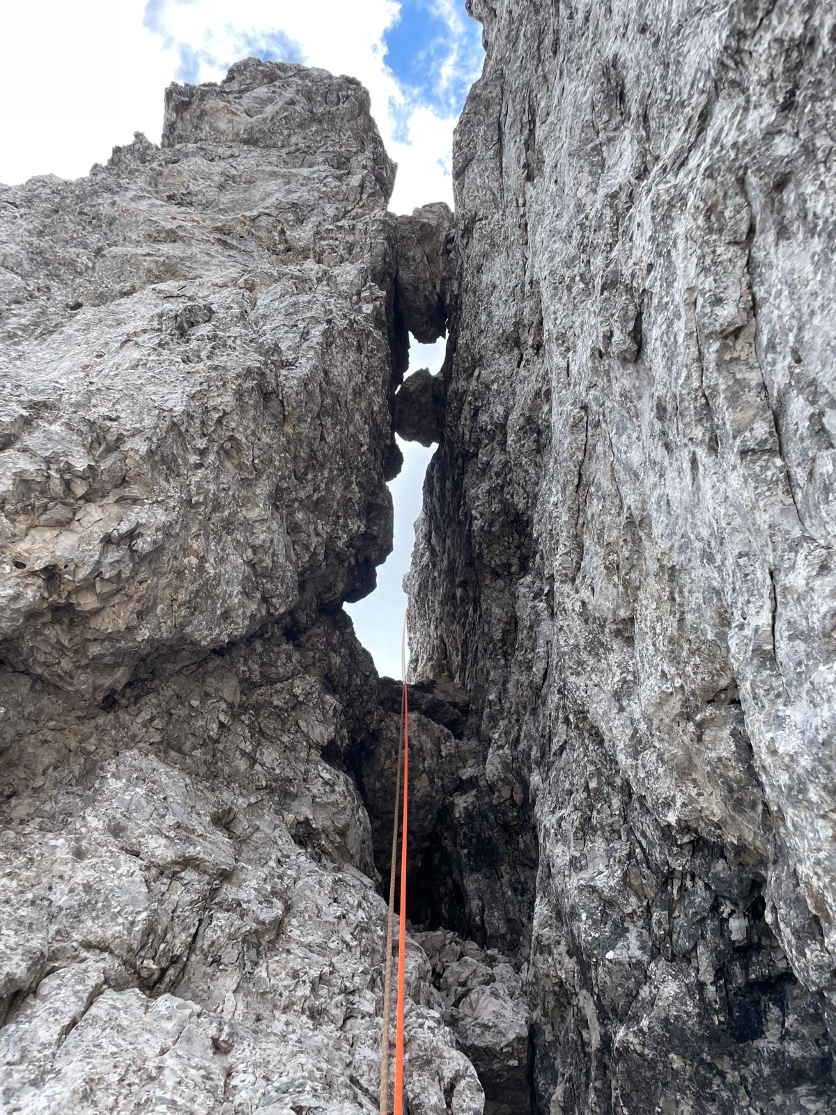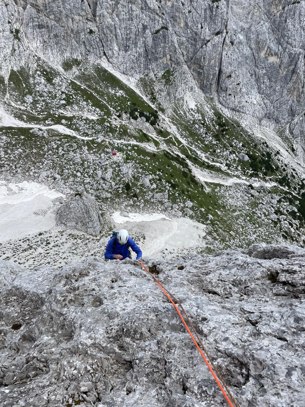 Z Aljažem Sušnikom pa sva plezala v Visoki Beli špici/ Cima Alta di Riobianco, smer Severni raz. Smer sem imel na listi želja že nekaj časa in vesel sem da mi je zanjo končno uspelo dobiti navezo. Resda je nekaj vožnje in tudi dostopa, vendar se vse poplača z lepim plezanjem v odlični, povsem dolomitski skali. Sidrišča so navrtana, nekaj najdemo tudi klinov. Lepo se je dalo uporabljati še metulje in zatiče, kjer je bilo to potrebno. Pred nama je bila naveza plezalcev, par srednjih let iz ao Kranj, ki sta jo menda, če sem pravilno razumel, plezala spet po tridesetih letih. Vsa čast, da nekdo najde toliko volje, in čestitke. V nekem vodničku sem našel rahlo drugačen vris smeri, ki je bil verjetno aktualen včasih, potekal pa je izgleda malo bolj direktno in bil zato morda pol nianse težji. Danes uveljavljen potek pa vsaj v spodnji polovici išče najbolj logične prehode, zgoraj pa direktno po razu. Detajl naj bi bil majhen kamin v drugem raztežaju, ki preseka steno nad manjšo polico, ocenjen s 4+. No nama z Aljažem se ni zdel težak, lepo se ga da, če ne drugače, preplezati z gvozdenjem . Prijemov in stopov okoli pa je veliko. Sestopila sva z dvema spustoma po vrvi, ker je bila tista dvojka, ki naj bi bila normalka za pristop, precej psihadelična. Ob povratku naju je čakal še skok v Rabeljsko jezero/ Lago del Predil, ki je vsekakor dodatna motivacija za obisk sten nad dolino Belega potoka.