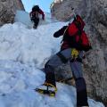 . Midva sva mu sledila. Že kar na začetku nas pričaka kratek ledni skok, sledi pa mu snežišče. Nadaljujemo po strmini navzgor, preko novega skalnega skoka do novega snežišča, kjer nas pričaka pravo poletno vreme. To ni pomlad, to je poletje, je bilo slišati iz Klemnovih ust. Krema za sončenje je bila zelo dobrodošla stvar, prav tako bi si takrat želel, da zjutraj ne bi pozabil sončnih očal.