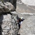 Z Luko Kramaričem pa sva splezala Zajedo v Skuti. Tudi tukaj naju je pričakalo snežišče, ki pa sva ga preplezala in se spustila v krajno zev. Dogovorila sva se, da vsak prepleza po dva raztežaja, torej prvega in drugega jaz, tretjega in četrtega pa Luka. Tako je Luka dobil detajl, ki si ga je zaželel splezati v vodstvu. Prvi raztežaj se je začel s pokončnim kaminom, ki se je kmalu položil in sledila je plata. Na začetku plate je možno urediti sidrišče, vendar se da, če nimaš prevelikega trenja vrvi, s 60 metrsko vrvjo nadaljevati in izdelati sidrišče na koncu plataste prečke, tako sem raztežaja povezal. Sledil je lep krajši kamin, nato pa je smer zavila za vogal, kjer sta na Lukata počakala navpična zajeda in kamin nad njo. Zajedasti detajl je lepo nabit, zaključi pa se z manjšim previskom. Kasneje je smer redko dosegla štirico, če sploh. Je pa v zgornjem delu tudi nekaj šodra. Kljub temu sva v smeri uživala in sklenil sem, da je vredna ponovnega obiska. Smer naj bi v izstopnem delu sledila južnemu razu, vendar je Luka našel zanimiv prehod s prečenjem kraške kotanje na levi strani zaključka stene. Na vrhu pa je sledil stisk roke in zaslužena malica. Sestopila sva čez Žmavčarje, mimo bivaka, kjer pa ni bilo posebnosti.