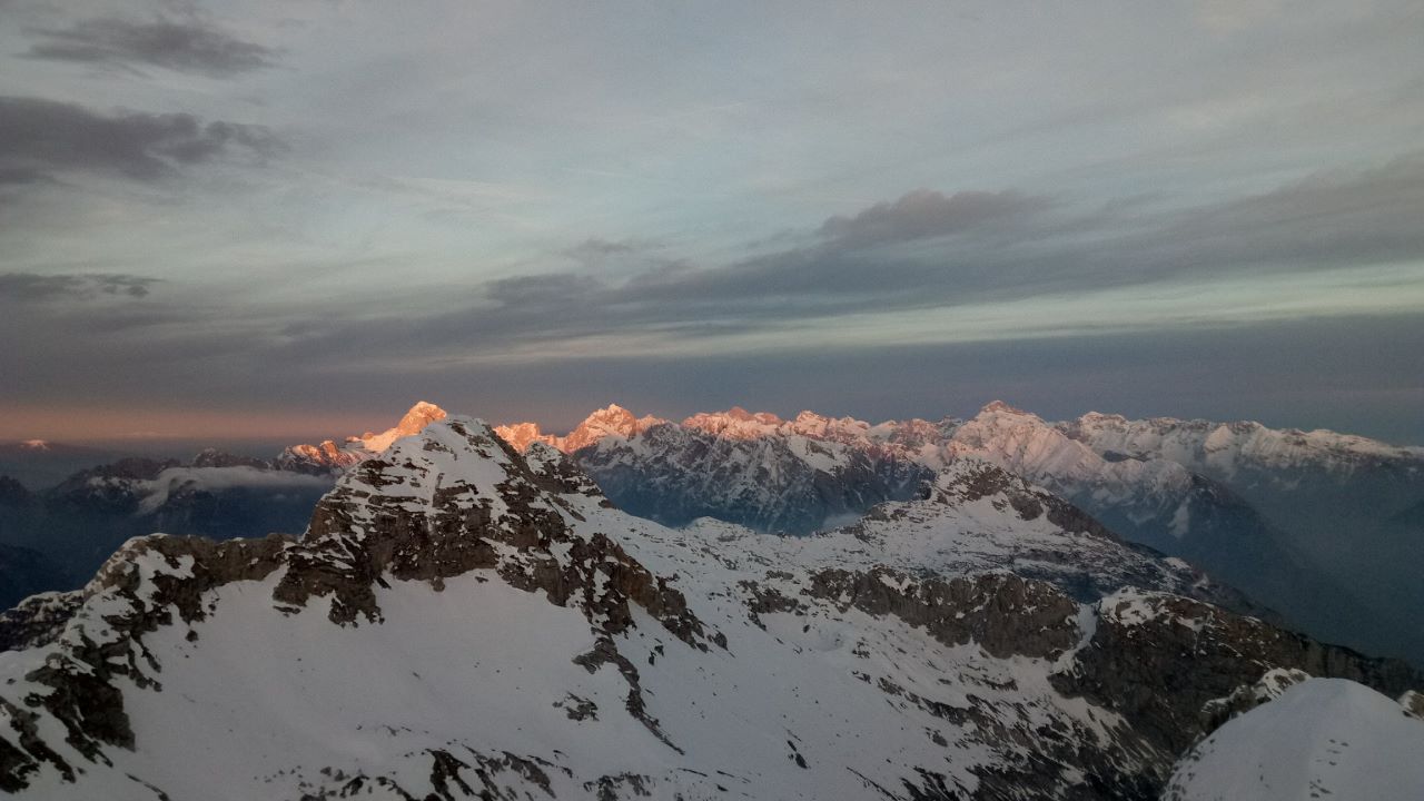 Ocena 4/5, M kar drži, le da je sneg v drugem raztežaju že zdelan in se ga je potrebno lotiti z veliko mero previdnosti.. Nato sledijo trije raztežaji po snežišču, izstop pa zavije levo od originala, ki gre naravnost(?), po razčlembah polic (tokrat so bele), in kratkega kaminčka. Na vrhu si nagrajen z veličastnimi razgledi na Zahodne in Osrednje Julijce in če zamudiš še zadnjo vožnjo v dolino, je razgled še toliko veličastnejši!