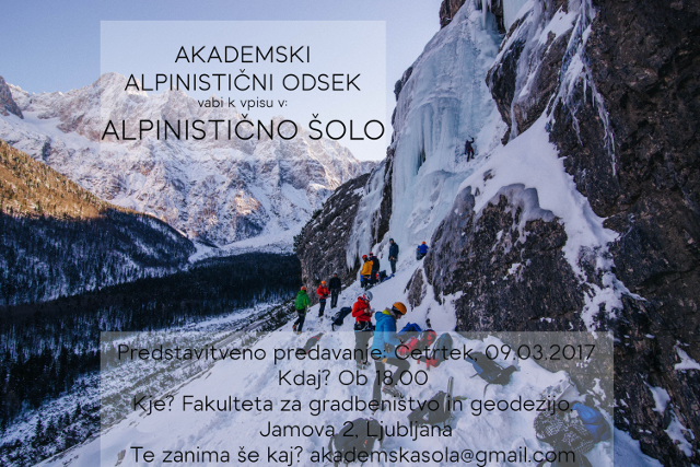 Vabljeni na predstavitveno predavanje AAO alpinistične šole za leto 2017/18 v četrtek 9.3. ob 18:00 na Fakulteti za gradbeništvo in geodezijo, na Jamovi 2 v Ljubljani.