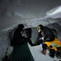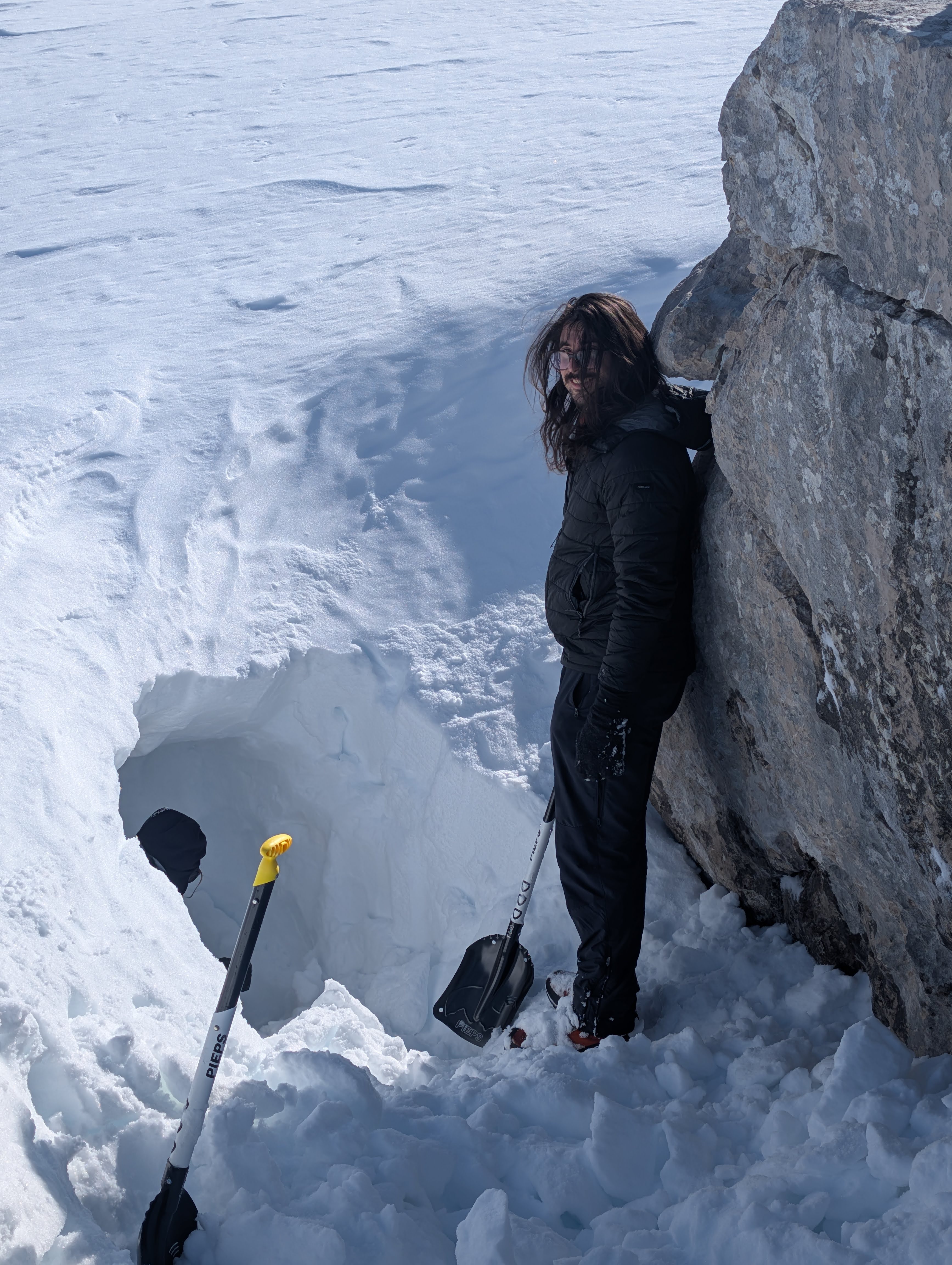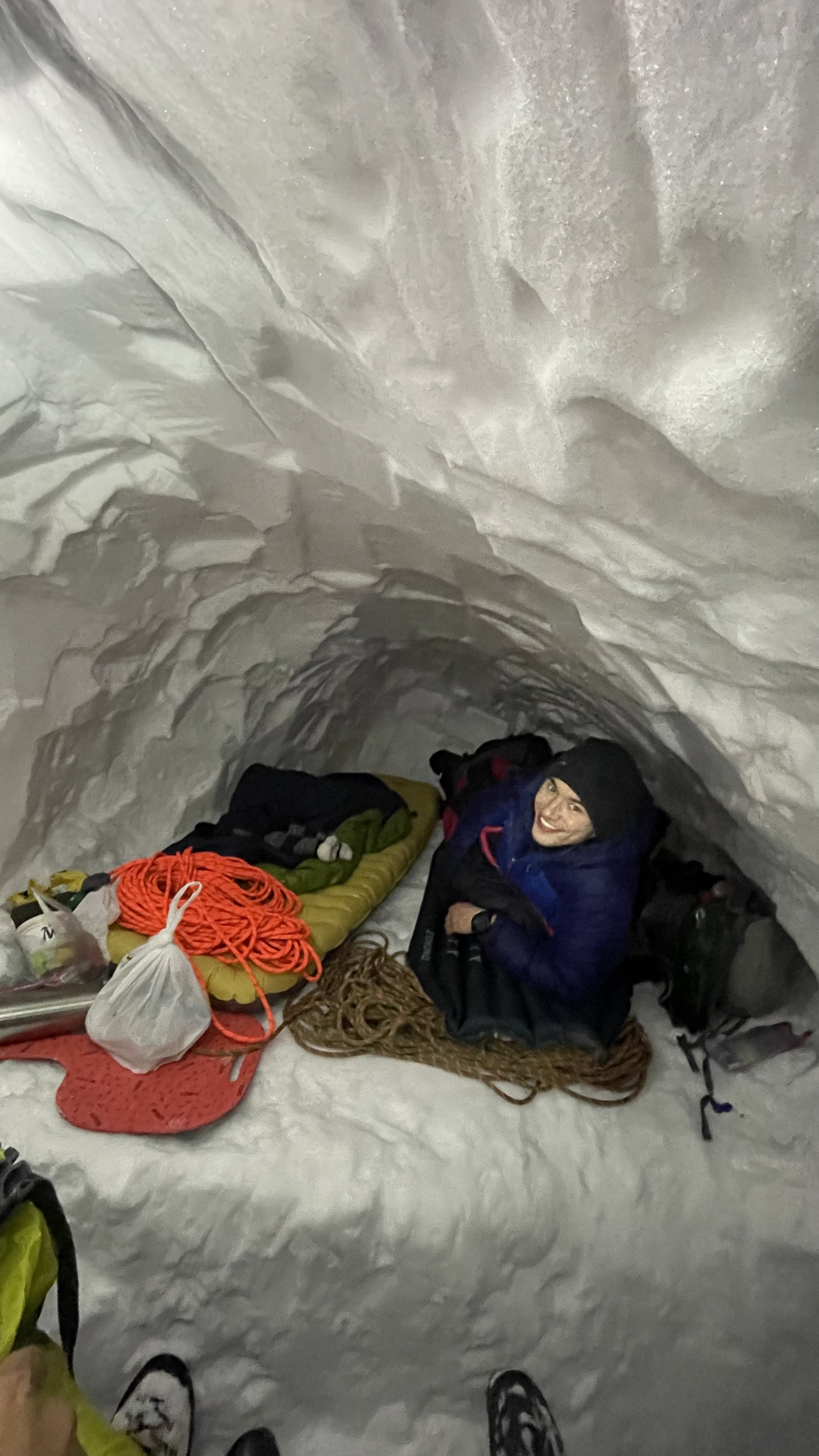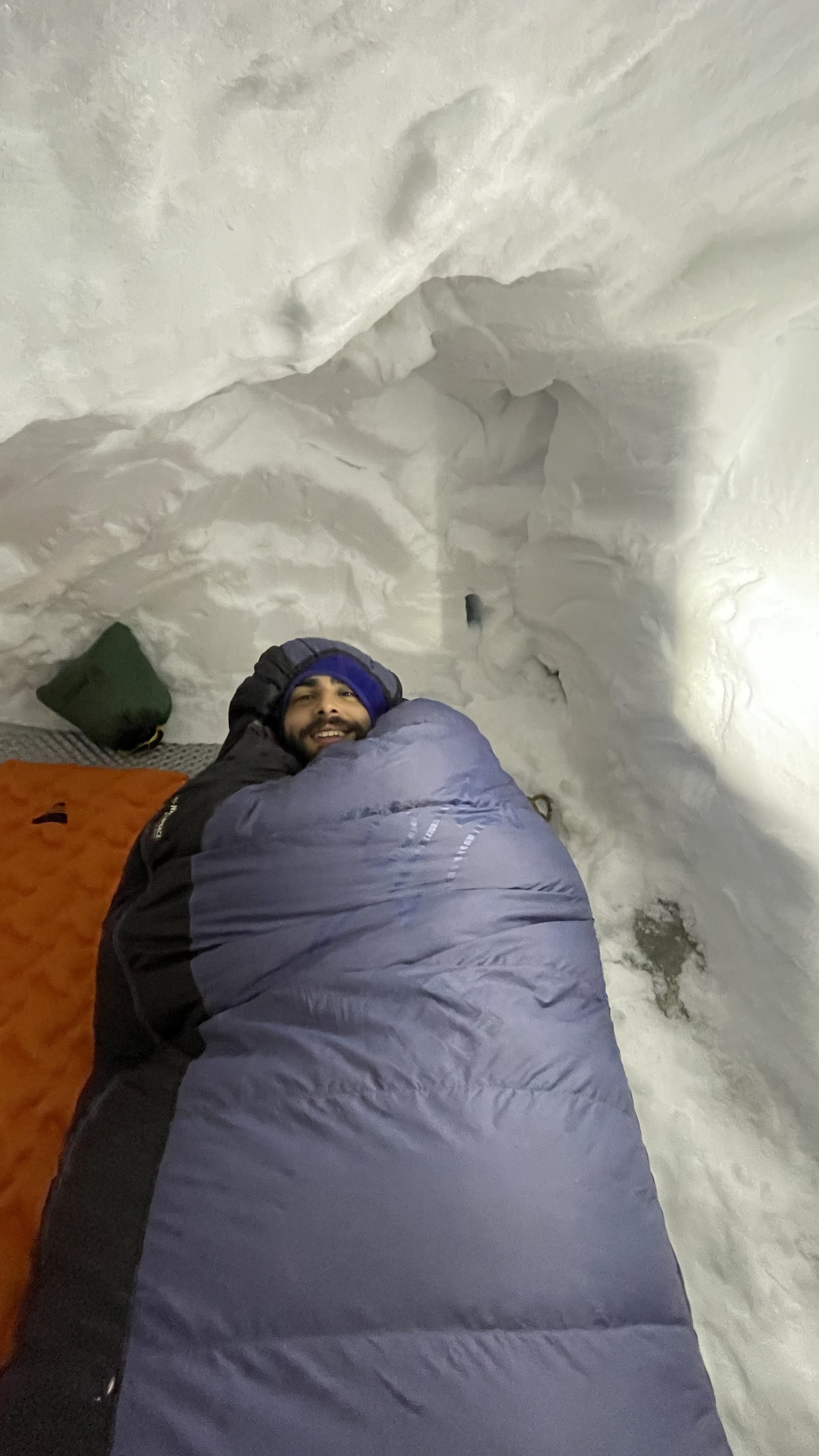 Zagnani pripravniki (Špela, Sandi, Beno, Marsel, Val, Gal, Aljaž, Luka, Jaka in Miha) smo ob dogovorjeni uri (nekateri, neverjetno, že tudi pol ure prej) čakali na štart, medtem ko so inštruktorji (Slapi, Matevž, Jurij in Rudi) še premagovali prvo oviro v obliki zaprte pekarne. Ko smo se vsi nabrali, smo s težkimi nahrbtniki, nekateri s smučmi, srečni izbranec pa tudi s split boardom, začeli pot iz Lepene proti Krnskemu jezeru. Cilj prvega dneva so bila relativno ravna snežišča nad Krnskim jezerom, pod Batognico in severno steno Krna. S smučmi ali ne, prvih 500 višinskih metrov smo vsi brez razlike prehodili, saj ni bilo sledu o kakršnem koli snegu. Ko je kamne na poti končno prekril bolj ali manj zbit sneg, smo tisti s smučmi to z veseljem izkoristili in pot nadaljevali v slow-motion imitaciji klasične tehnike (beri hoje na smučeh). Po cca dveh urah smo prečili zaledenelo Krnsko jezero in naredili krajši postanek, nato pa pot nadaljevali še za cca uro in pol. Ko smo končno prišli na idilično glamping lokacijo z izjemnim pogledom na Triglav in okoliške gore, so noge in hrbti že pošteno boleli. Kljub temu se nismo preveč obotavljali ter začeli s kopanjem snežnih lukenj. Količina snega je omogočala praktično neomejeno izživljanje otroških sanj o kopanju ogromnih iglujev. V naslednjih treh urah smo tako iz snežnega pobočja, po različnih trenutnih arhitekturnih / notranje dizajnerskih navdihih, izkopali po nekaj deset kubičnih metrov snega. Tukaj je bil izjema Rudi, ki se je odločil za bolj odprt pristop ki pa, kot lahko preberemo ob pregledovanju novodobnih nepremičninskih oglasov, omogoča tesno povezanost z naravo. No, tisto noč smo z naravo bili precej tesno povezani vsi. Skupaj smo izkopali pet bivakov, v katerih smo noč vsi preživeli bolj ali manj udobno, prav pa so prišli tudi različni nasveti inštruktorjev, npr. ovijanje nog v puhico, plastenka s toplo vodo v spalki, …
