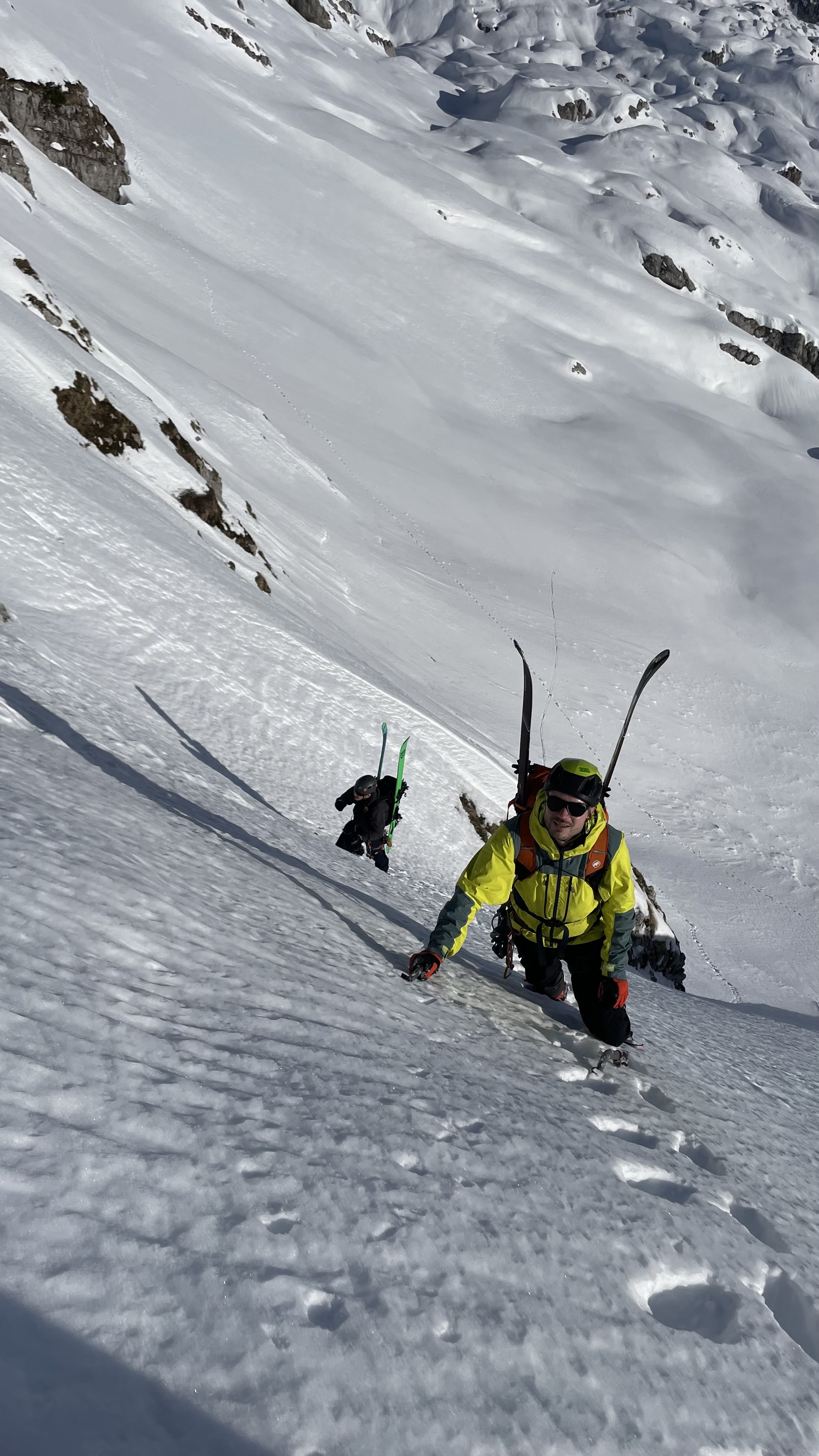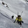 Nekaj ur kasneje smo se ob svitu zbudili v čudovito jutro. Triglav na drugi strani bohinjske doline, se je že kopal v sončnih žarkih, medtem ko je na naši strani še prevladovala senca in posledično tudi mraz. Večina udeležencev (Špela, Beno, Sandi, Val, Jaka, Miha in Marsel, skupaj s Slapijem, Matevžem in Jurijem) si je za nedeljsko turo izbrala grebensko prečenje vrhov okoli Lužnice, ki so ga zaključili z vzponom na Vrh nad Peski. Nekateri so sam greben še dodatno začinili s plezanjem grape. Aljaž, Gal, Luka in Rudi pa smo se, s smučmi na hrbtu, odločili za vzpon na Krn, ki smo ga začeli v neizrazitem kaminu nekje v sredini severne stene, nadaljevali s precej izpostavljeno prečko proti zahodu in nato prek grebena v grapo, ki nas je popeljala naravnost na vrh Krna. Kar je manjkalo plezalnim razmeram so zagotovo nadomestile odlične razmere za smuk po južnih pobočjih Krna proti sedlu med Krnom in Batognico. Od tam sta Rudi in Gal nadaljevala še na Vrh nad Peski, Aljaž in Luka pa sta si v taboru privoščila zasluženo kosilo.
