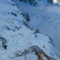 Po začetnih treh cugih dobro zalite snežne linije nama je smer postregla s precej suho zajedo in pričakovano kopno detajlno prečko, kjer sva se v duhu šestdesetih let pošteno namučila s suhoorodjarsko in ročno tehniko plezanja. Nad prečko se nama prehod v levo ni zdel preveč obetaven zato sva jo ubrala v desno, kjer sva po desetih metrih kar zahtevnega miksa prišla na širok snežni trak, ki pa vodi le do velike strehe. Pod to streho sva le nekaj minut pred temo našla prostor za bivak, kakršnega si lahko človek samo želi. Po precej topli in udobni noči sva začela s krajšim spustom in mestoma zahtevnim plezanjem preko raza proti zgornjemu sistemu polic. Utrujenost, ura in pogled na kopno vršno glavo so nama dali znak, da izstopiva po policah. Sneg na policah ni bil najboljši, varovanje pa se je vseeno dalo nameščati. V izstopnem skoku je bil sneg precej slab, zato sva se tudi tu precej namučila.
