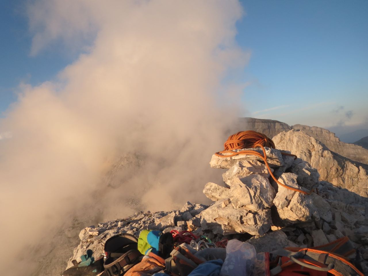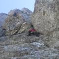 Dnevi so še vedno dopuščali tudi kakšen popoldanski izlet med tednom, tako sva se z Maticom spravila v Vodnjak želja (VI-/V-VI, 280 m) na severni strani Nad Šitom Glave, tihi plani o dveh smereh so se razblinili še preden je prvi zares stopil v steno, direktne poskuse po zajedi se je po nekaj časa zamenjalo z lažjim poplezavanjem nekaj metrov bolj levo. Smer ponudi cca 4-5 raztežajev konstantne plezarije, nekoliko bolj zoprn in hkrati zanimiv je detajl previsa nad gredo (zaželene velike pesti).