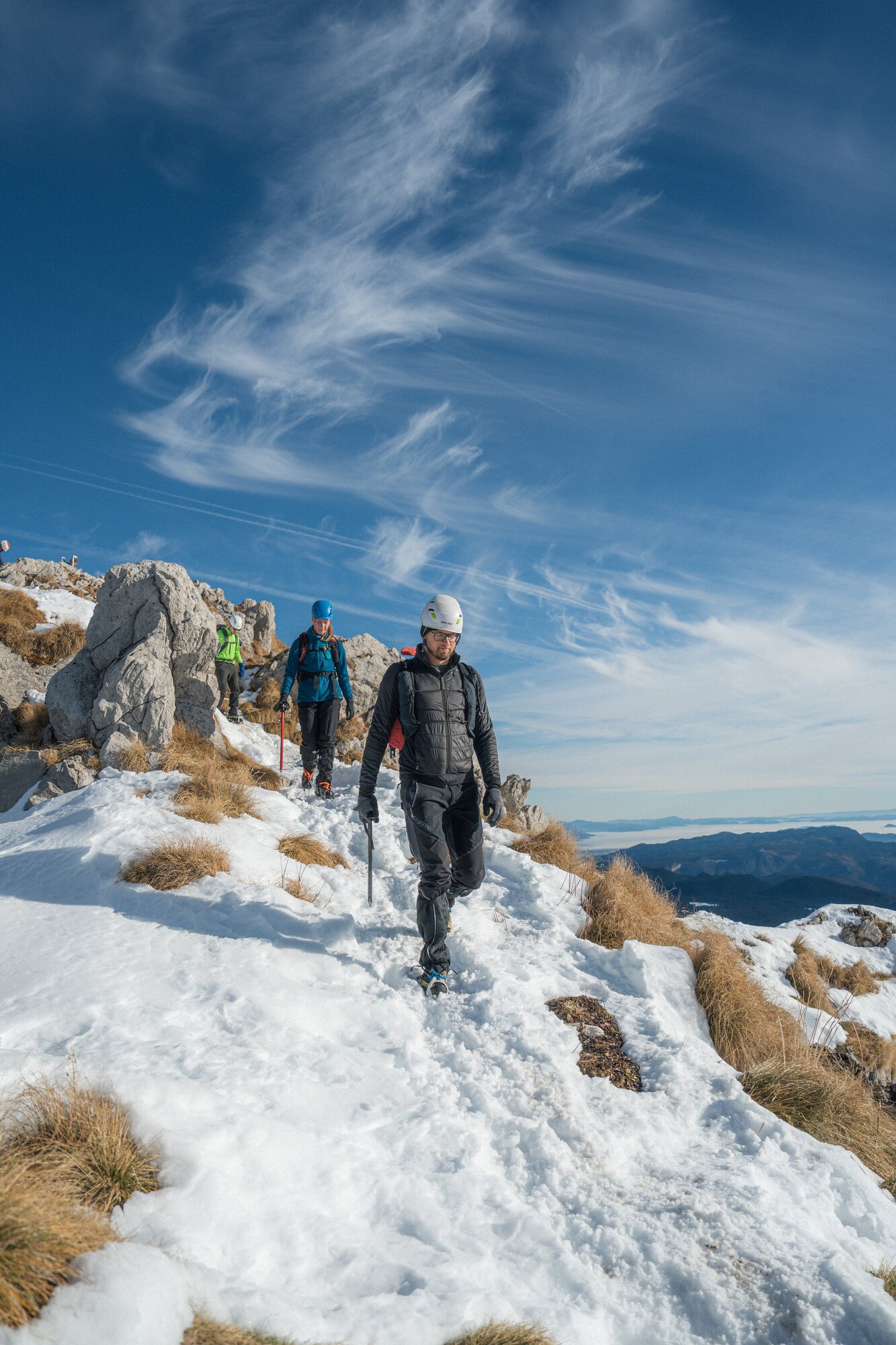 Razmere so bile decembrske: snega ponekod za vzorec, drugje dovolj, nebo pa brez oblačka. To nas seveda ni ustavilo, da ne bi s seboj vlekli celotnega arzenala. Štartali smo polno opremljeni: čelade, cepini, težki zimski gojzarji in gora oblačil.
