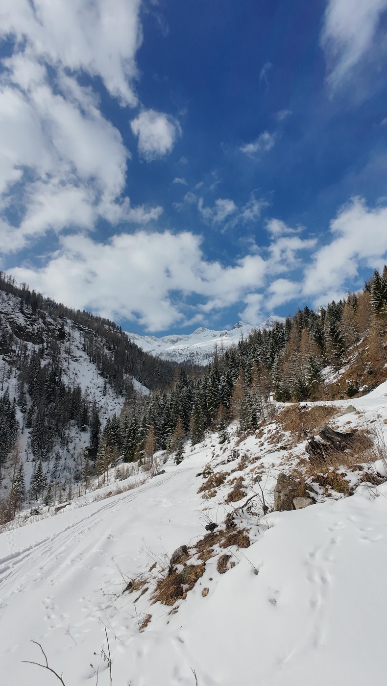 . Sem si pa obljubil, da to popravim. Ker sva nekako, morda malce preveč optimistično, pričakovala, da bo cesta proti koči Giessener kopna vsaj kakih 500 višinskih metrov če ne več, in hoja s smučmi na hrbtu po asfaltu ne bo prijetna, sva s seboj vzela prevozna sredstva na kolesih. Žal sva se uštela, saj se je sneg začel že spodaj, na 1200 mnv, pri spodnji rampi. Pa tudi nisva bila edina, saj je tudi nek avstrijski par svoji e-kolesi bil primoran pustiti na kombiju. Razmere tod so še povsem zimske. Tako sem po desetih letih spet obul turne pancarje in nataknil turne smuči. In že sva zagrizla v klanec, po skoraj popolnoma zasneženi cesti. Cesto je le na nekaj mestih prekinil meter ali dva asfalta. Rudija so noge kaj hitro odnesle stran, medtem ko sem se jaz ponovno učil tehnike turne hoje. Rahlo siten, ker zjutraj nisem dobil svoje doze kofeina