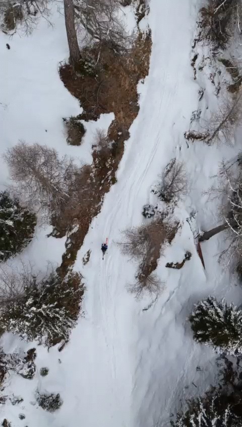 sem poskušal kolikor se je pač dalo hitro slediti brutalnemu tempu, pa mi je kljub temu pobegnil daleč naprej. Na okoli 1700 mnv se nahaja akumulacijsko jezero Gosskarspecher, do koder se najbrž z avtom lahko pride poleti. Sneg je postajal vse bolj južen, in začele so se nama delati cokle. Nad cesto je nekaj časa brenčal tudi Rudijev dron, saj se je odločil narediti nekaj posnetkov iz ptičje perspektive. Okrog 13h sva dosegla kočo na 2200 mnv, kjer sem jaz po prehojenih 1000 višincih sklenil, da bo za prvič mojega turiranja zadosti. Pa tudi pancarji so me ožulili, in nisem hotel tvegati še večje škode. Vrh pač počaka. Rudi pa je pobrcal v breg, kot bi ga lovila zver, in kmalu izginil za belim obzorjem. Odšel sem v bivak, kjer sem zakuril malo litoželezno peč. Notranjost bivaka je ob domačnem vonju in prasketanju gorečih polen kaj hitro postala toplejša. Okrepčal sem se s čajem in jafa keksi ter malo raziskoval okolico. Ker sem ocenil, da bo okoli 16h pri vrhu, na povratku pa zaradi smuke hiter, sem po 16. uri na vsake toliko odšel pogledat ven in spogledom prečesaval veliko pobočje velikanske gore. Tako sem kakih 20 minut čez štiri opazil drobno pikico, ki se je počasi premikala v sestopu. Ko je prismučal je imel jasno nasmeh do ušes. Menda je bilo zgoraj pri vrhu dokaj ledeno, večji del smuke pa mehak, uživaški sneg. Na kratko sva se še ogrela v bivaku, pospravila in začel se je še spodnji del smuke po poti in cesti. Prvih nekaj minut sem bil malo lesen, saj letos nisem smučal niti alpsko, kmalu pa se je v noge vrnil pravi občutek, in vriskajoč sva oddrvela proti spodnjemu parkingu, ki sva ga dosegla še v dnevni svetlobi.