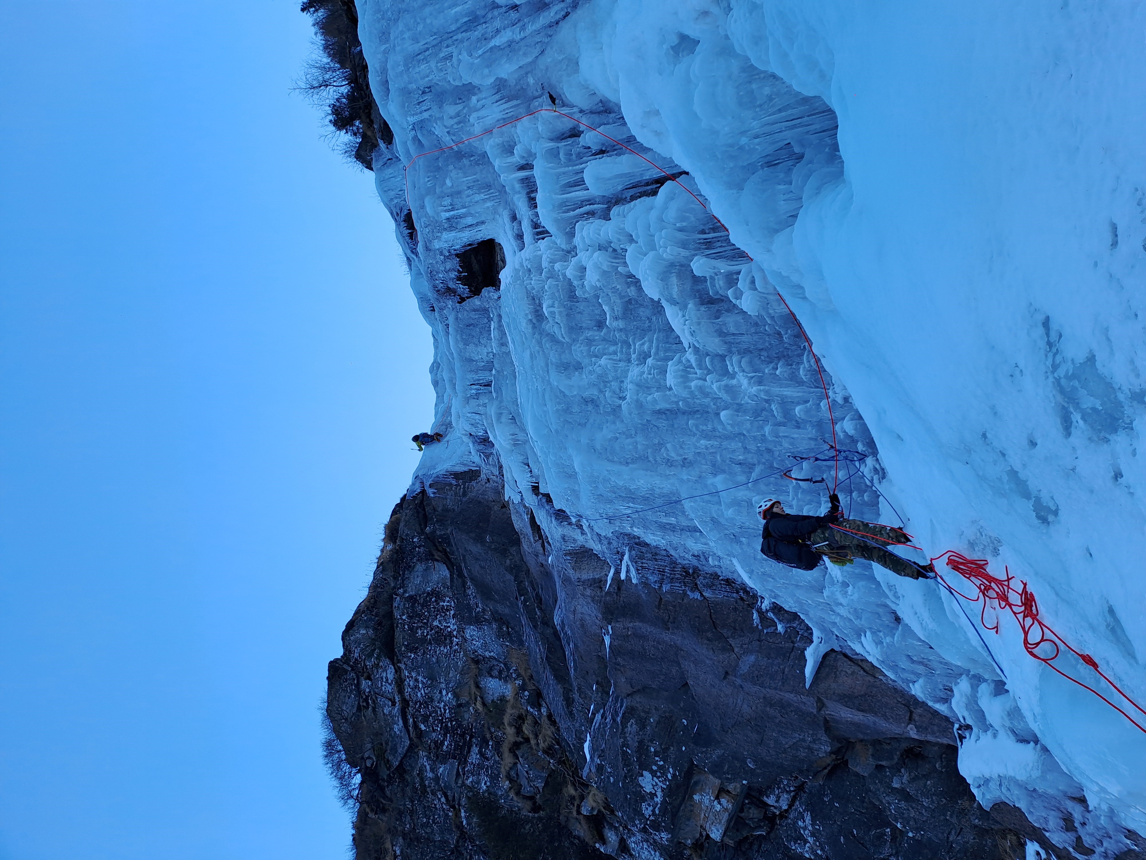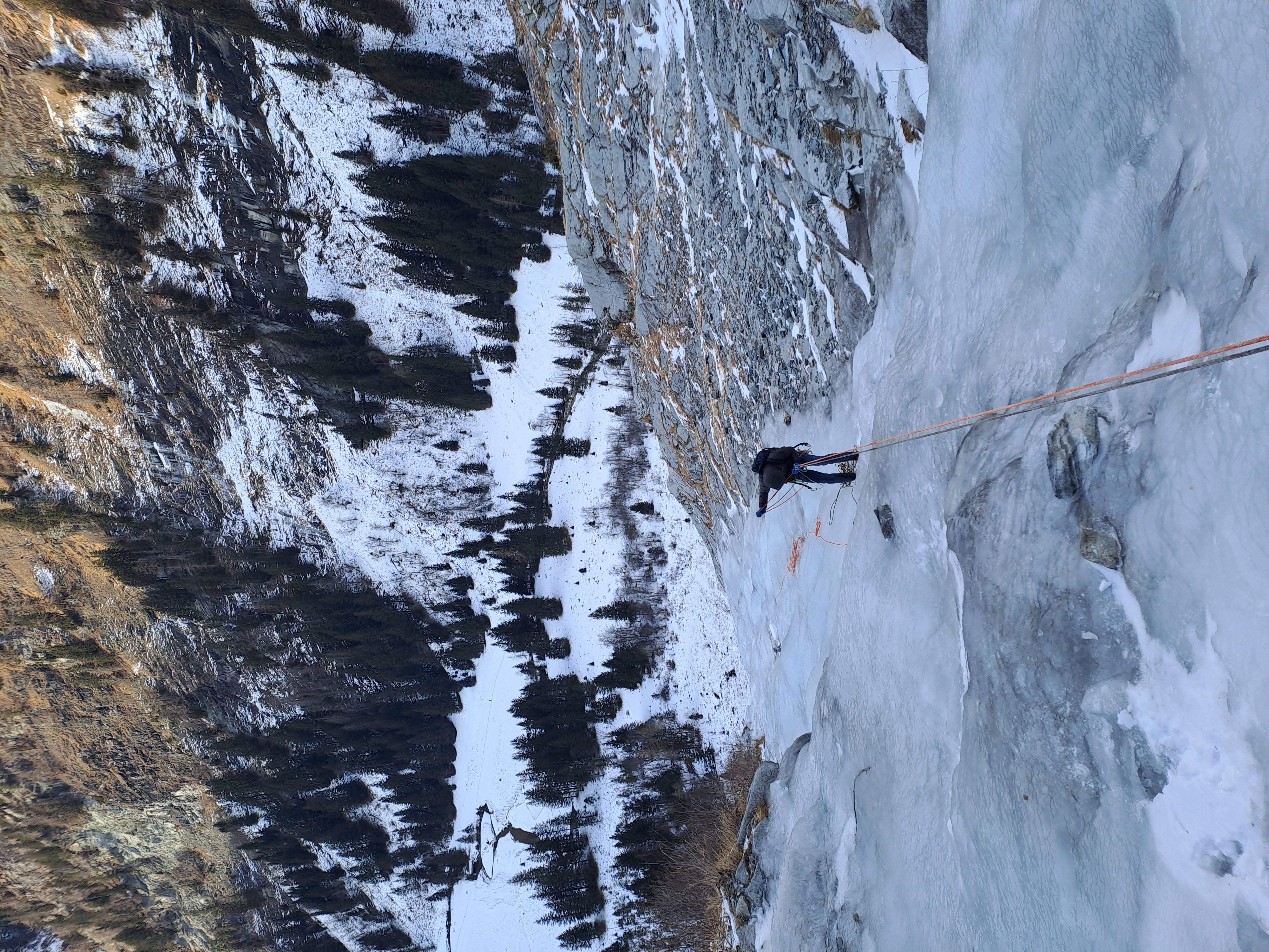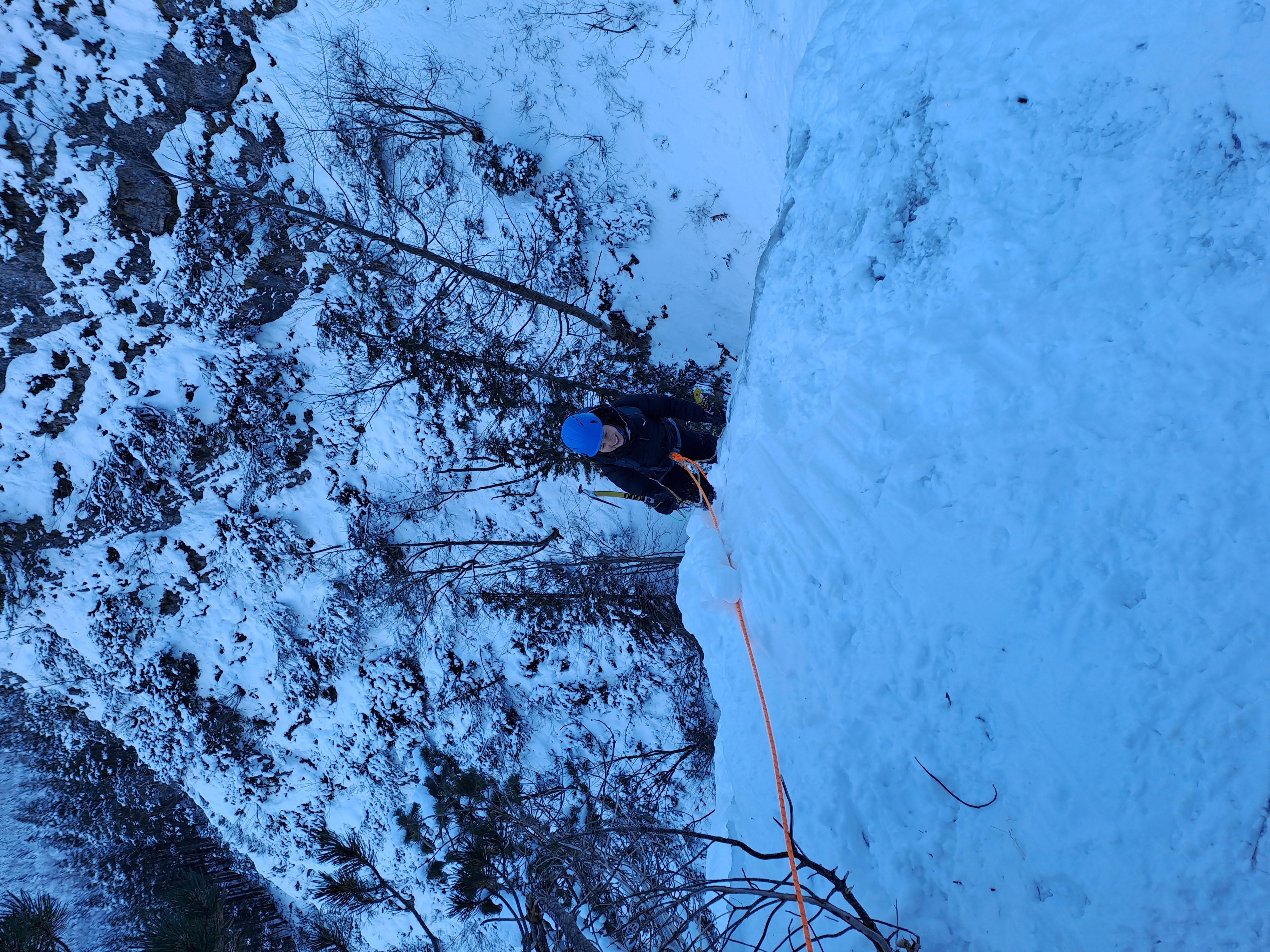 V tem delu je sicer malo teklo, bilo je kar položno, naredila sem sidrišče, nato pa se je Gal izkazal v bolj strmem delu, ki naj bi bil »le 3«, a je stal precej pokončno. Ko se je Gal tako vzpenjal čez zadnje metre, sta Špela in Tratar že vrgla vrv in se začela spuščati. Med tem je najina vrv začela zmrzovati, skozi reverso se je premikala le s silovitimi potegi. No, pa je vseeno šlo. Ko je Gal zaklical, da varuje, sem še sama zamahnila s cepini in priplezala do njega, seveda takoj zatem, ko mi je uspelo rešiti zapletene komplete iz derez. Zdaj vem, počepi niso za v led.