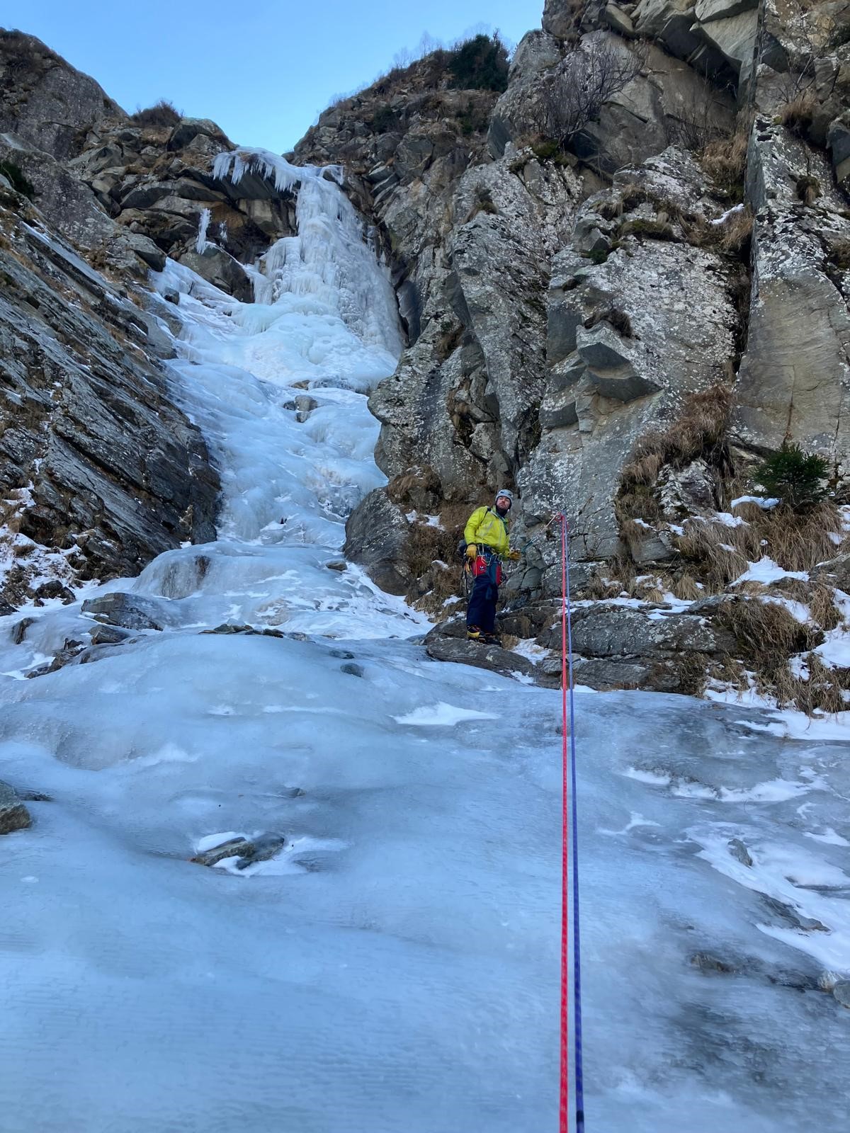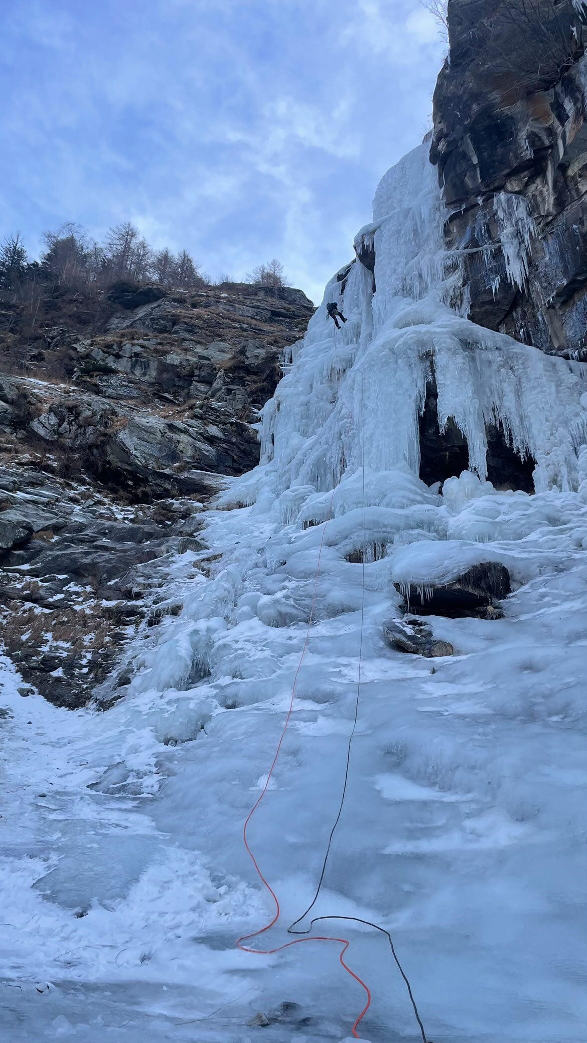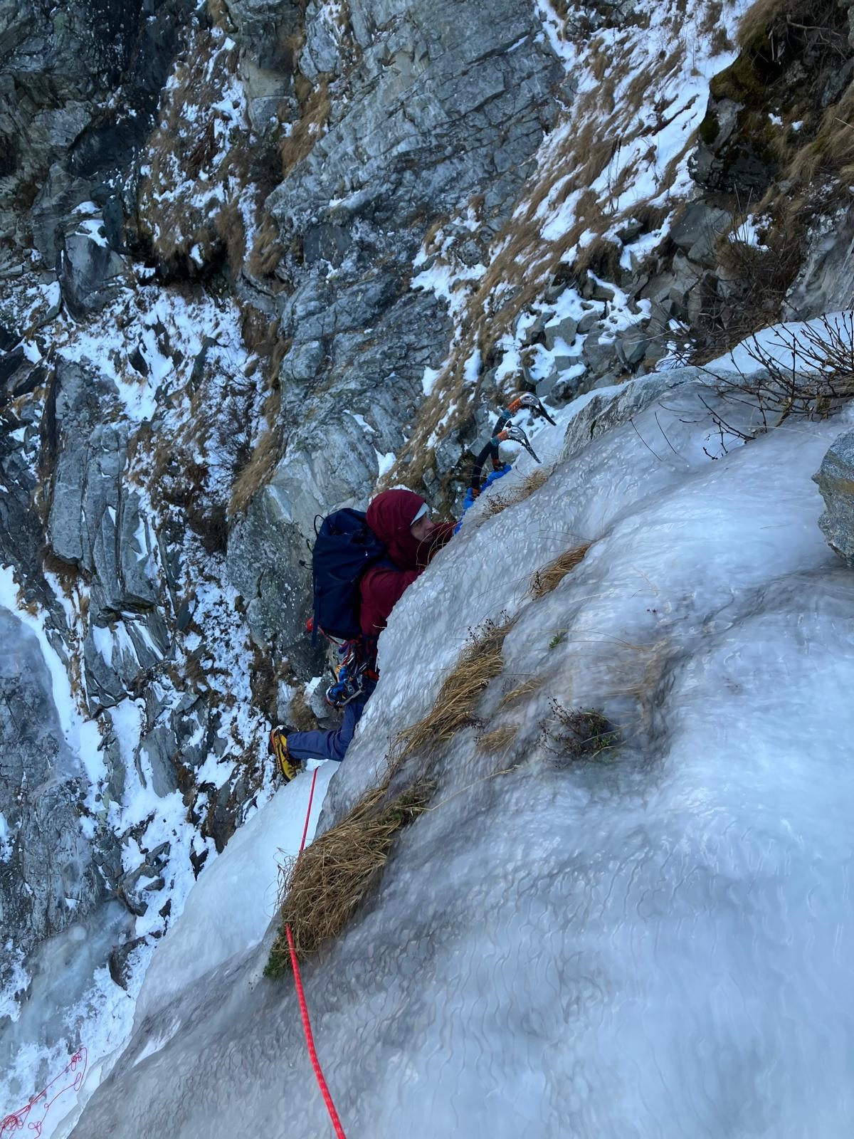 Tako je padla ideja, da se nama Žan pridruži v navezi. Malo zatem smo se navezali, Primož je začel plezati, ko nam je GRS-jevec, ki je slap ravno preplezal sporočil, da se je zgoraj nekdo poškodoval, ter opozoril na previdnost. Prvi raztežaj je bil najbolj strm, dolg 40 m, 80° – 90°, hkrati pa najlepši. Led je bil ravno prav mehak/trd, da so se cepini zanesljivo zapičili vanj, vijaki so držali, gobice so dajale oporo nogam, kot druga v navezi sva z Žanom res »samo šla«. Ko smo prišli do položnega dela, so tam že bili reševalci, ki so poškodovanega pripravljali za spust. Prišlo je do poškodbe noge – držimo pesti, da se čimprej zaceli!