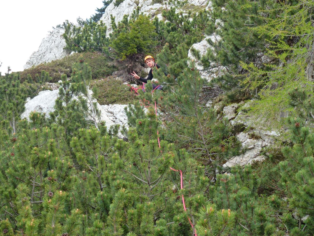 ker sva imela na koncu vsega dovolj, sva jo užgala kar po svoje in proti vrhu sestopila po kozorogovi smeri. sama smer je sicer bolj primerna za zimsko plezarijo. za letno se nama je predvsem v srednjem in zgornjem delu zdela preveč zaraščena in krušljiva. dobre, trdne skale je bolj malo. v takih trenutkih se človek šele zave, zakaj se splača 5h vozit v paklo.