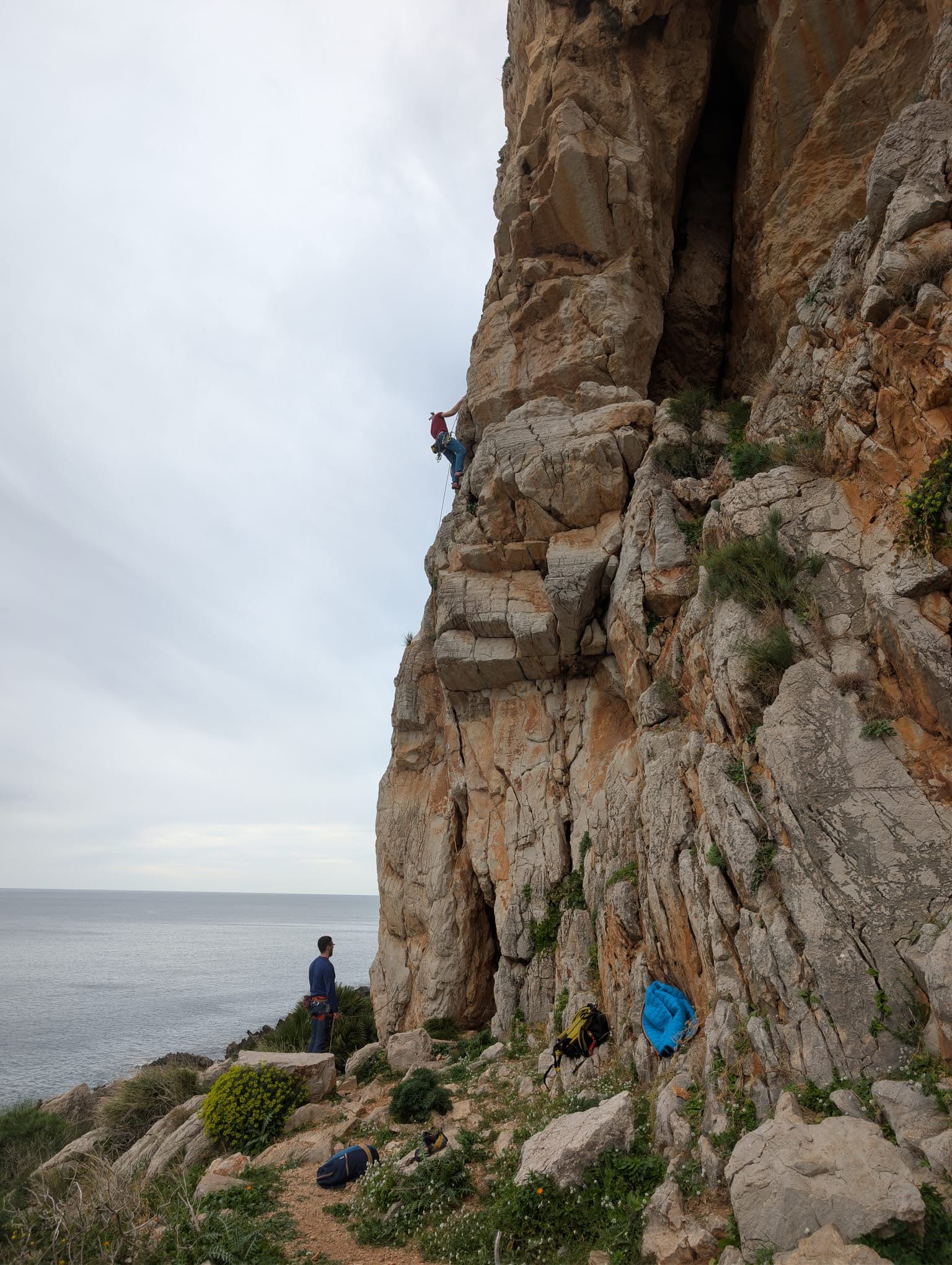 Z novim zagonom smo se kaj kmalu podali po že znani poti, preko vseh cart-potrebnih mac, ki jih je priklical Grega in sta jih spotoma s priboljški obravnavali Julija in Inga, do širnih prostranstev bodičastih grmičkov in rahlo nemarno razmetanih kamnin do novih plezalnih izzivov. Tokrat smo dan začeli deljeno - Jaka, Janez, Jaz in (J)Beno smo dan pričeli v sloviti Jami neznanega imena. Pravzaprav ima ime: Grotta della palma. Sektor, z le nekaj in to precej začinjenimi smermi. Drugi del odprave, ki so ga sestavljali Grega, Inga in Julija pa se je podal proti malce bolj oddaljenem sektorju… Bunker. No, tokrat na odseku “Magic Woman”. Tu se je pokazalo še nekaj krasnih smeri in za nami celo nekaj delfinov v morju. Prijetno utrujeni smo tudi ta dan končali naplezani in ob kuharskih mojstrinah Jake in Grege.